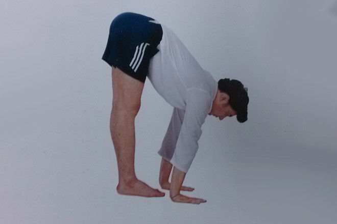 3、呼氣時背部前屈,雙掌放於地面上,雙掌距離與肩同寬。