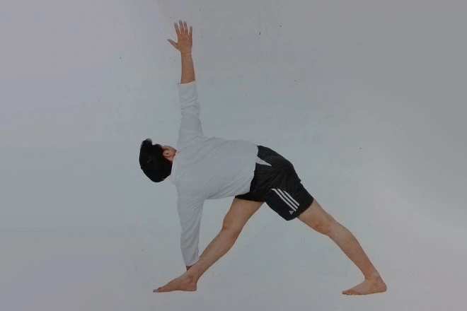 6、呼氣,在左側重複該體式。左腳向左轉90度,右腳向左轉60度,右手手掌放於左腳外側地面。兩側保持同樣的時間,即3~4個呼吸。