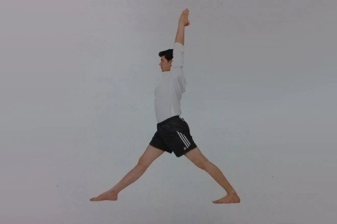 3、吸氣,雙臂向上充分伸展,雙臂分開與肩同寬。呼氣,身體彎曲轉向右側,右腳向右轉90度,左腳向右轉60度,保持左腳伸展,膝蓋繃直,雙臂、雙腿伸直,肘關節繃緊,眼睛向前看。保持正常呼吸。