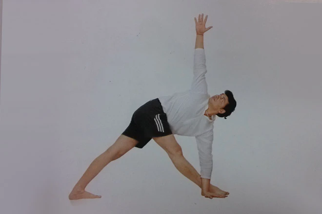 4、呼氣,軀幹與左腿一起向右轉,身體向下,左手掌放在右腳外側的地面;右臂向上伸展,與左臂呈一條直線,眼睛向上注視右手手指,注意膝蓋要繃直,右腳腳趾及左腳外側不要離開地面,伸展肩部和肩胛骨。保持這個姿勢30秒鐘,正常呼吸。