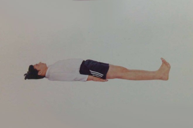 1、平躺在地面上,雙臂放於身體兩側,手掌心向下,腳趾尖朝上。