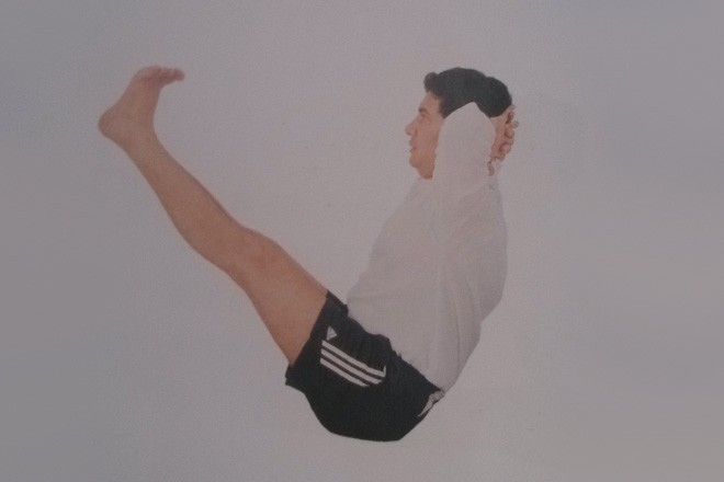 2、雙手十指相扣抱在腦後,呼氣,身體和雙腿同時抬起,用臀部保持平衡,雙腿伸直,膝蓋繃緊,腳與頭基本處於同一條水平線上,脊柱的任何部位都不能接觸地面。保持正常呼吸。