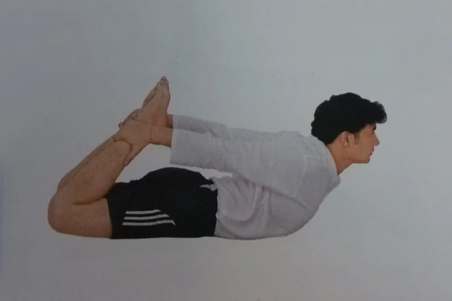 3、完全呼氣,雙臂拉動雙腿抬離地面,同時帶動胸部離地,身體呈弓形。盡可能保持正常呼吸,保持這個體式約30秒鐘,呼氣,鬆開腳踝,雙腿伸直,身體放下,回到體式1.