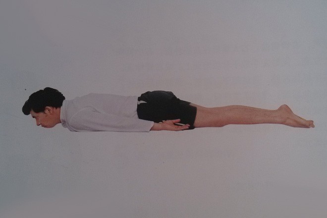 1、整個身體俯臥在地面上,下頜觸底,雙臂放在身體兩側,手掌心向上。調整2個深呼吸。