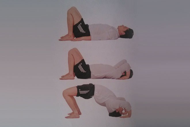 3、呼氣,身體向上抬起,頭頂放在墊子上。