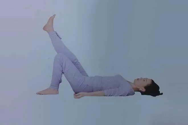 1、練習者腳靠牆,平躺在墊子上,雙臂放在身體兩側,雙腿保持彎曲,腰背充分與地面接觸。做2~3個自然呼吸。