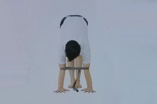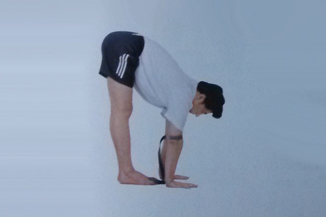 1、調整好瑜伽帶尺寸,將其套在雙肘關節的位置上,使雙肘之間的距離與肩同寬。背部前屈,雙掌防禦點在上,雙掌距離與肩同寬。