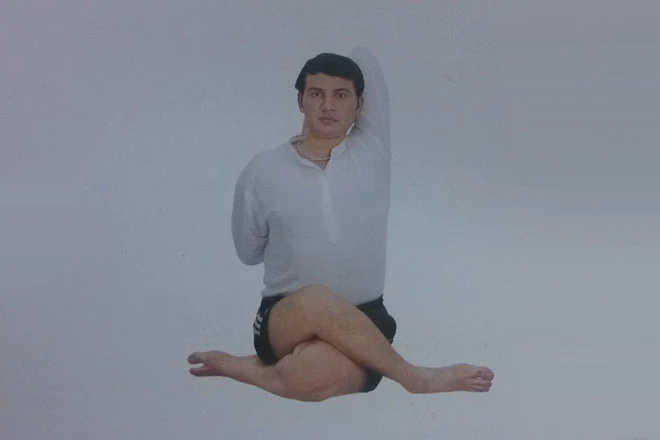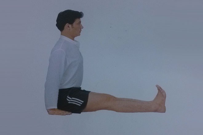 1、練習者以手杖式坐姿坐在瑜伽墊上,雙腿伸直,脊柱挺直,自然平視前方,雙臂放在身體兩側。