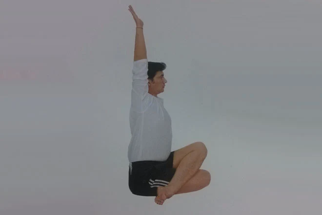 3、左腿再彎曲,左腳貼於右臀部外側,左膝蓋朝前,雙膝疊放在一條直線上。吸氣,右臂向上充分伸展。