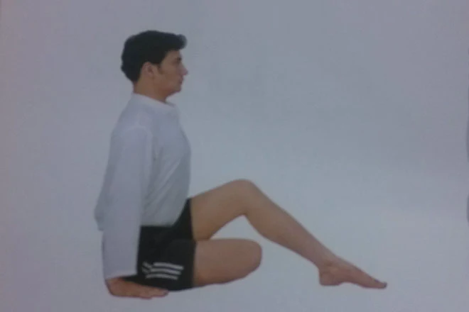 2、左腿稍彎曲,右腿於左腿下方彎曲,膝蓋朝正前方,腳心朝後,右腳腳跟貼住左臀部外側。