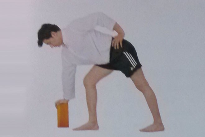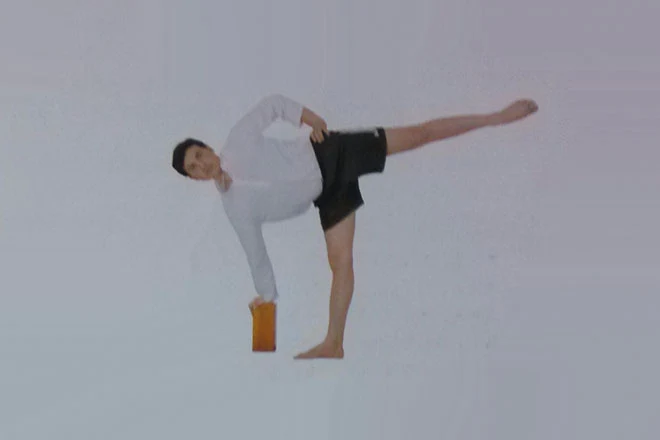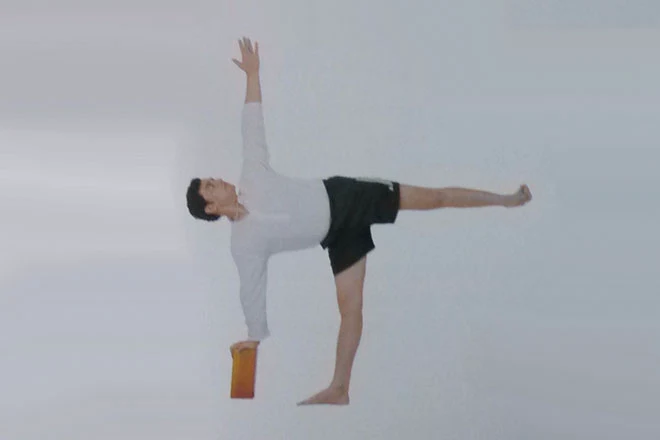 1、練習者站在墊子上,瑜伽磚放在右腳外側,右手掌放在瑜伽磚上。