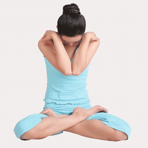 5、呼氣,含胸,雙肘向前繞,肘尖相觸。