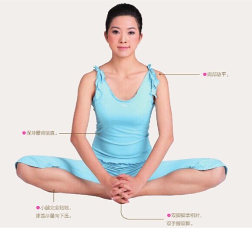 這個姿勢對身體的柔韌性要求較高,不要勉強練習,感覺舒適即可,否則容易拉傷韌帶和肌肉。雙腿下壓時,要盡量使兩膝打開貼地。