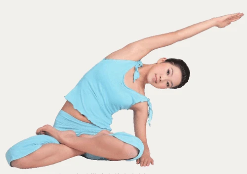 盤坐伸展式先以蓮花坐盤坐,將身體的能量聚集在骨盆區域,然後再由手臂帶動身體向一側伸展、下壓,從而激發人體內部的潛能,使之從尾骨處直通大腦。