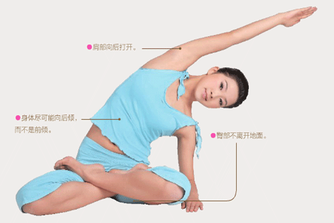 側身伸展的幅度應控制在自己身體能夠承受的範圍內,若感覺側腰拉伸時有疼痛感,立刻停止手臂下壓的動作。練習時,肩部向後打開,臀部不能離地。