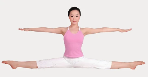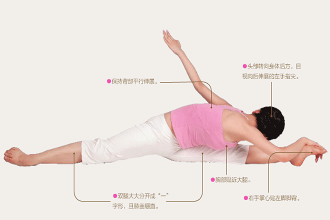 拉伸脊椎,膝蓋下壓。轉動和延伸的動作一定要由腰和髖帶領。如雙腿分開成一條直線較為困難,那麼根據身體條件分到最大極限就可以。