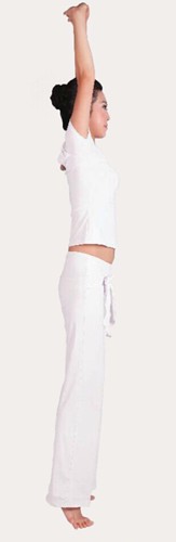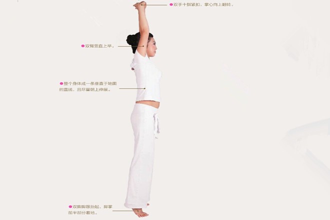 意識集中:意識集中在頭頂和上舉的雙手上,體會身體不斷向上伸展的感覺。腳跟離地時,注意力放在腳掌靠近大腳趾的部位。