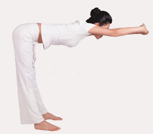 3、呼氣,腳跟落地,雙臂帶動上半身向前向下伸展,直至與地面平行,使整個身體成直角。掌心朝向身體正前方,保持數秒。