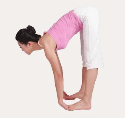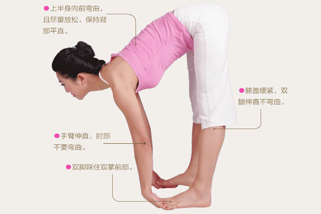 3、呼氣,上身向前彎曲,盡量放鬆,雙腳踩住雙掌前部。保持數秒,身體還原至基本站姿。