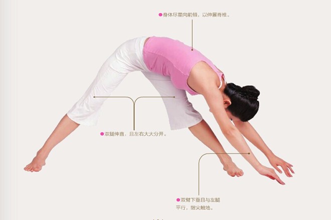 3、吸氣,上身和雙臂向右側橫移,直至雙臂與右腿平行,指尖依然觸地。呼氣,身體還原,反方向重複練習一次。