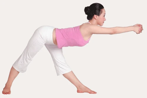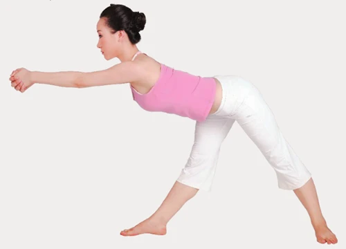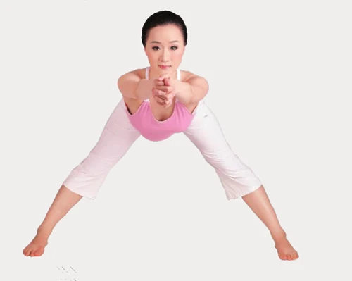 1、站立,雙腳左右盡量分開,雙手握拳。吸氣,以髖部為折點向前彎腰,雙臂、上身都與地面保持平行,雙臂盡力向前延伸。