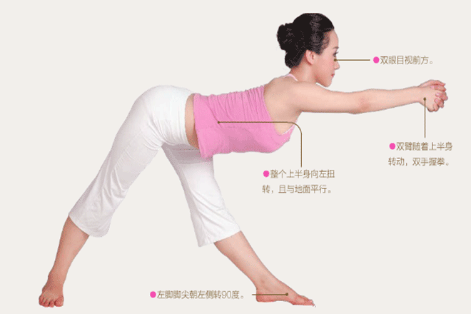 2、呼氣。雙手向右轉動,用腰部力量帶動軀幹轉動,直至極限。
