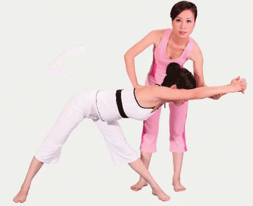 盡量將上半身拉到最長最遠,使身體得到充分的舒展。眼睛始終看向相握的雙手。背部在轉動過程中,始終與地面保持平行。