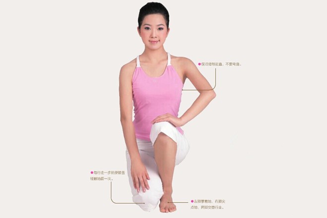 動作過程中,務必保持背部挺直,不要彎曲,每行一步就使膝蓋碰觸地面以此。你喜歡練習多長時間都可以,但要小心不要過於勞累。