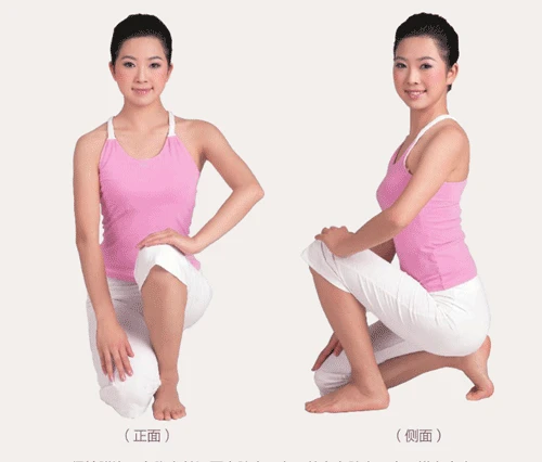 2、保持蹲姿,左腳向前邁至右膝旁,左手放在左膝上,右手搭在右大腿上,左腳掌著地,右膝蓋和又腳尖點地。