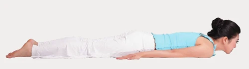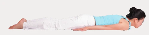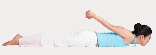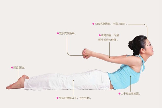 練習這個體式時,雙手於背後交握,手臂伸直,盡量朝後方拉伸,以此帶動上半身和頭部抬起離地。