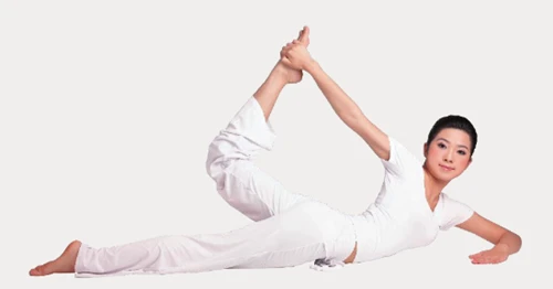 3、吸氣,側身,彎曲左腿,右手握住左腳。右手臂用力向上拉左腿,使身體呈弓狀,頭隨著肩膀的扭動而向右轉。