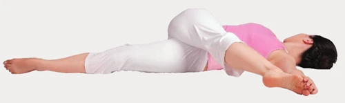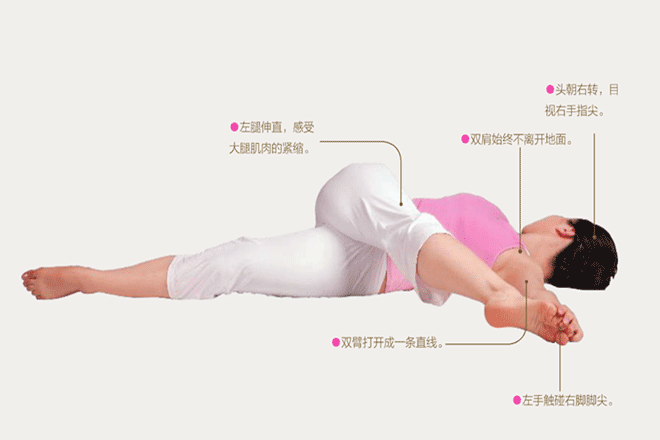 3、呼氣,右腳找左手,左手觸碰右腳腳趾。頭轉向右側,雙肩不要離開地面。保持數秒。