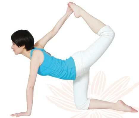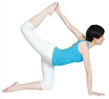 4、呼氣,右腿向上彎曲,左臂同時向上向後伸展,左手抓住右腳腳尖,眼睛看向前方,保持姿勢20秒。