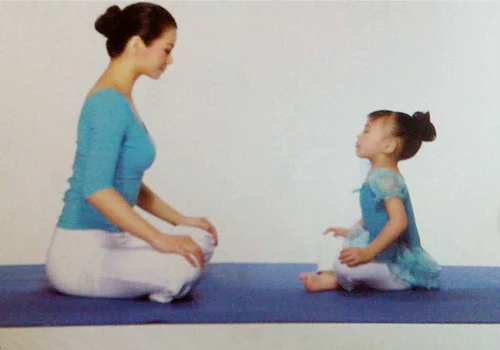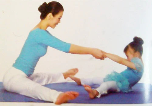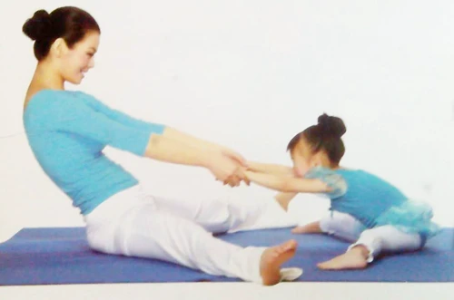 親子瑜伽-坐角式不但可以柔軟腿部,促進全身血液循環,還可以增強身體抵抗力。但要注意的是練習的過程中大人和孩子要始終保持手臂伸直。