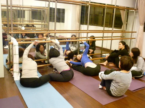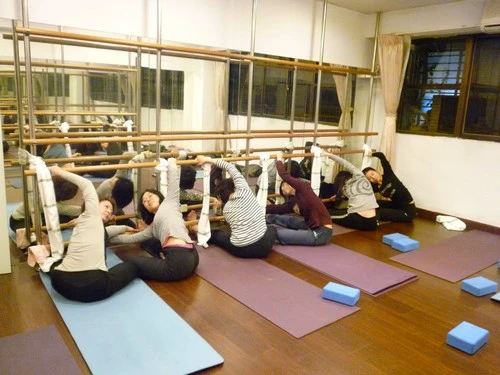 1、雙人一組練習,面向把竿,將內側的膝蓋彎曲,外側的腳伸直抵著鏡子預備,可取一伸展帶固定直立的把竿上,視情況決定是否使用。