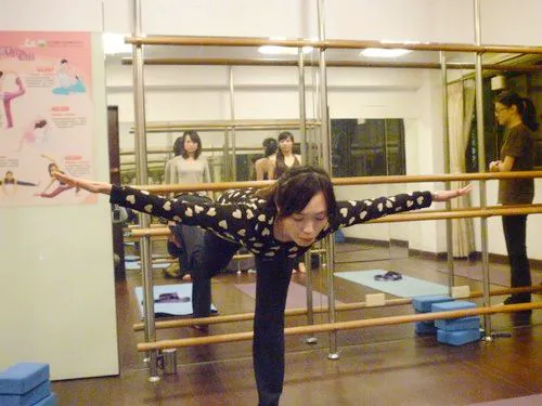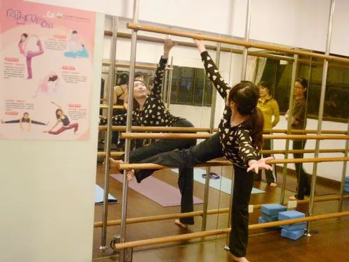 1、 背對把竿,重心移到左腳,右腳勾在把竿上,右腳打直並與地板平行。