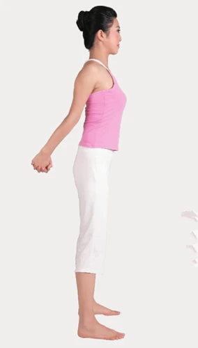 4、吸氣,抬頭,起身,雙臂自然垂於體側。