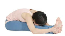 5.深呼吸,向下彎曲手肘,帶動上半身繼續向腿部靠攏,雙手抓住兩腳掌,保持姿勢20秒。