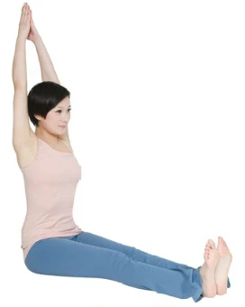2.吸氣,腰背挺直,雙臂向上伸展,雙手在頭頂上方合十,雙臂帶動脊柱向上伸展,體會背部向上牽拉的感覺。