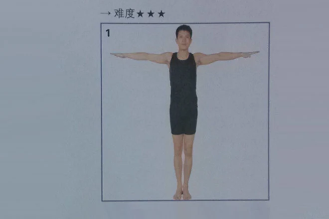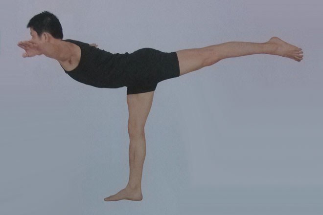 2、抬升左腿向後伸展,達到與地面平行的高度,同時帶動軀幹和頭部前傾,軀幹與地面平行。右腿繃直,右腳緊壓地面,保持身體平衡。保持這個體式30~60秒,正常地呼吸。