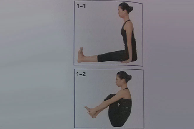 1、以手杖式坐立。彎曲雙膝,把腳靠近臀部,雙手分別抓住同側腳掌,大腿貼近腹部,膝蓋向胸部靠近。