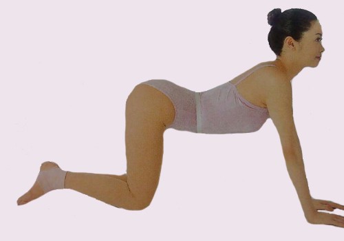 2、吸氣,將背部向上弓,右膝向頭部方向內縮,頭也盡量向右膝方向內縮,吐氣,停留數秒,做深呼吸。