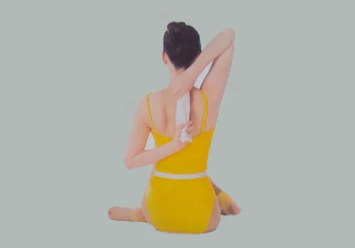 雙腳交叉疊坐時,若膝蓋會疼痛,就不要勉強,停留時間不用太長,此外雙手在背後如果互握不到,可以用雙手拉住毛巾代替,久了柔軟程度增加後就可握到手了。