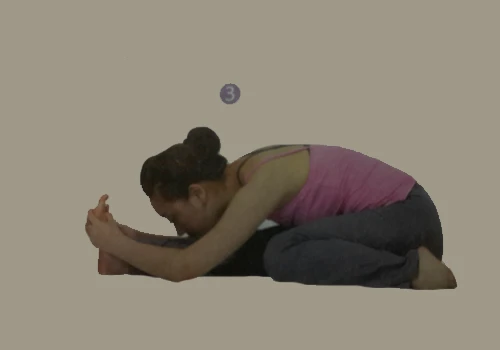 3、勾手腕環繞住伸展的右腳。呼氣,上身前屈,依次將頭、鼻子、嘴唇、下巴放在右膝上,身體的重量應該放在彎曲的膝蓋上。保持這個體式均勻呼吸。然後在身體另一側重複這個體式。