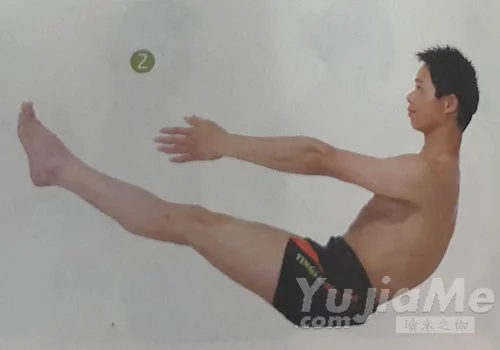 2、呼氣,身體稍向後靠,同時從地面抬起雙腿,膝部繃緊,使其如一根棍子一樣筆直,腳趾朝前,身體的平衡僅靠臀部保持,而脊柱的任何一部分都不能接觸地面,腿部與地面保持在60°角,雙手離開地面,