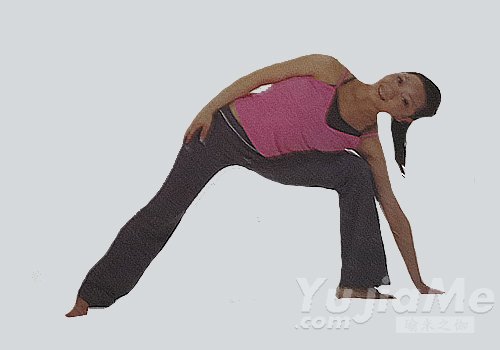 完成側角伸展式。呼氣,左手掌落在左腳外30公分處,右臂緊貼右腿,正常呼吸,保持幾秒。換身體另一側重複練習。