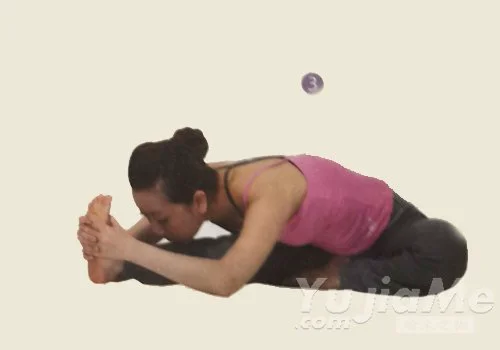 3、從腰部開始身體向前向下俯身,背部保持伸展。雙手抓住右腳腳掌,稍屈肘,拉動身體貼近右腿,腳尖後勾,放鬆頸部。保持一段時間,身體逐漸回到正直,