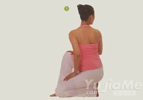 3、軀幹盡量向右扭轉,眼睛看向後側,帶動頸椎做扭轉。