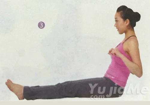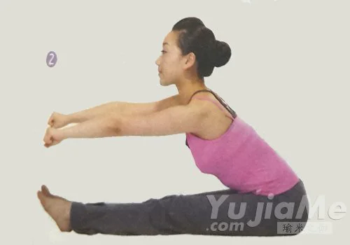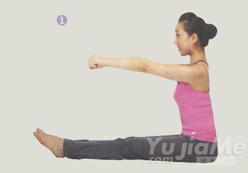 1、坐在地上,雙腿伸向體前。雙臂向前平舉,與雙腿平行,雙手握拳。