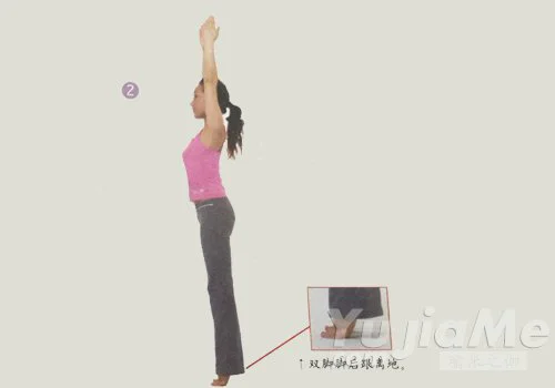 2、吸氣,雙臂伸直,舉過頭頂,舉到耳後時呼氣,同時頭向後仰。
